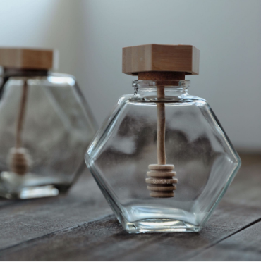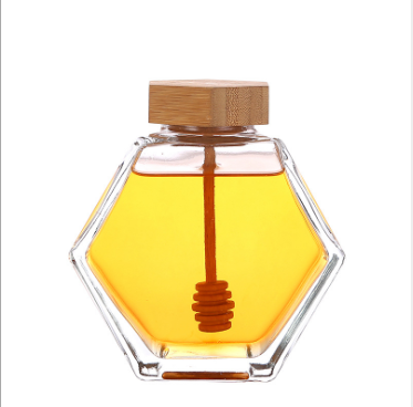 220ml 380ml Empty Hexagonal Honey Glass Jar with Wooden Dipper
