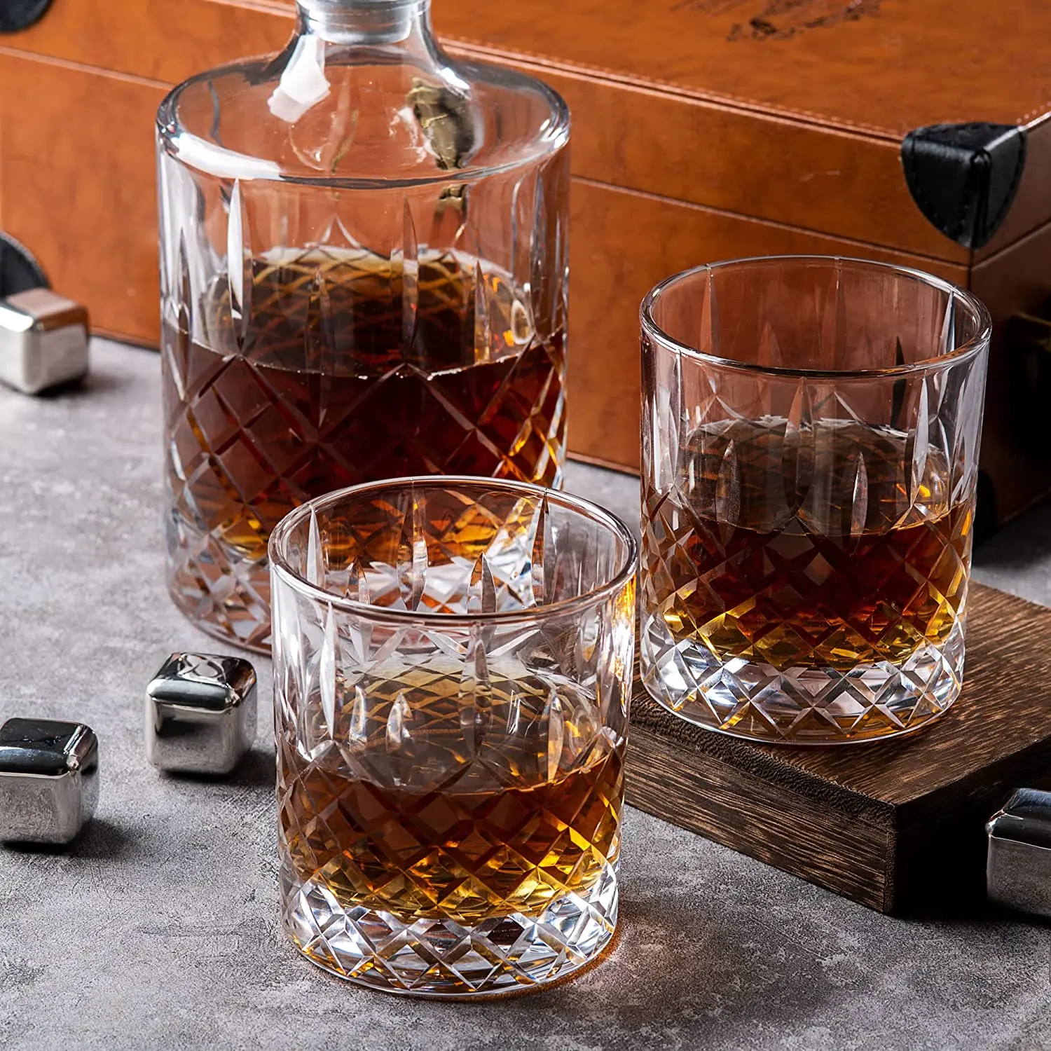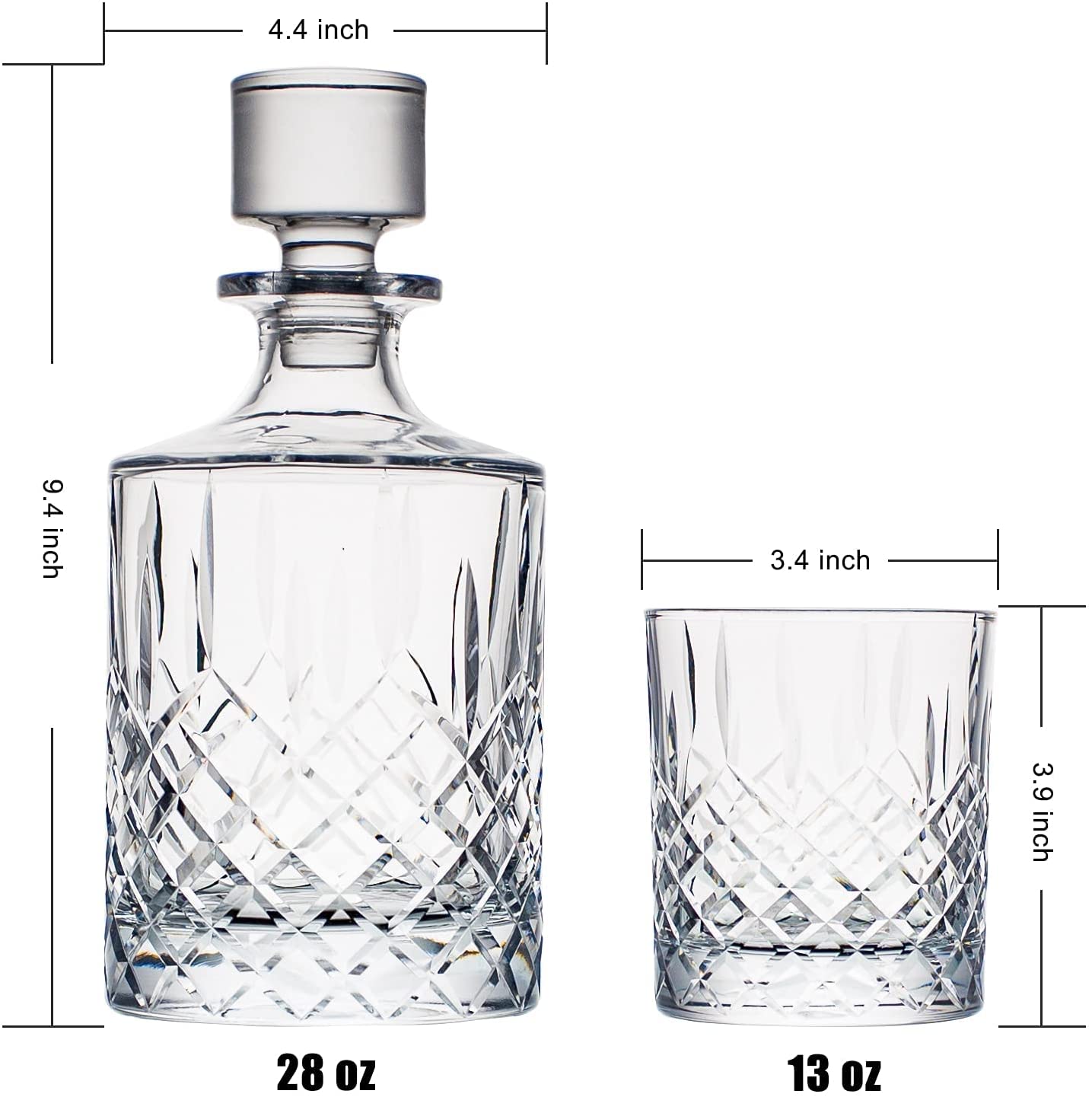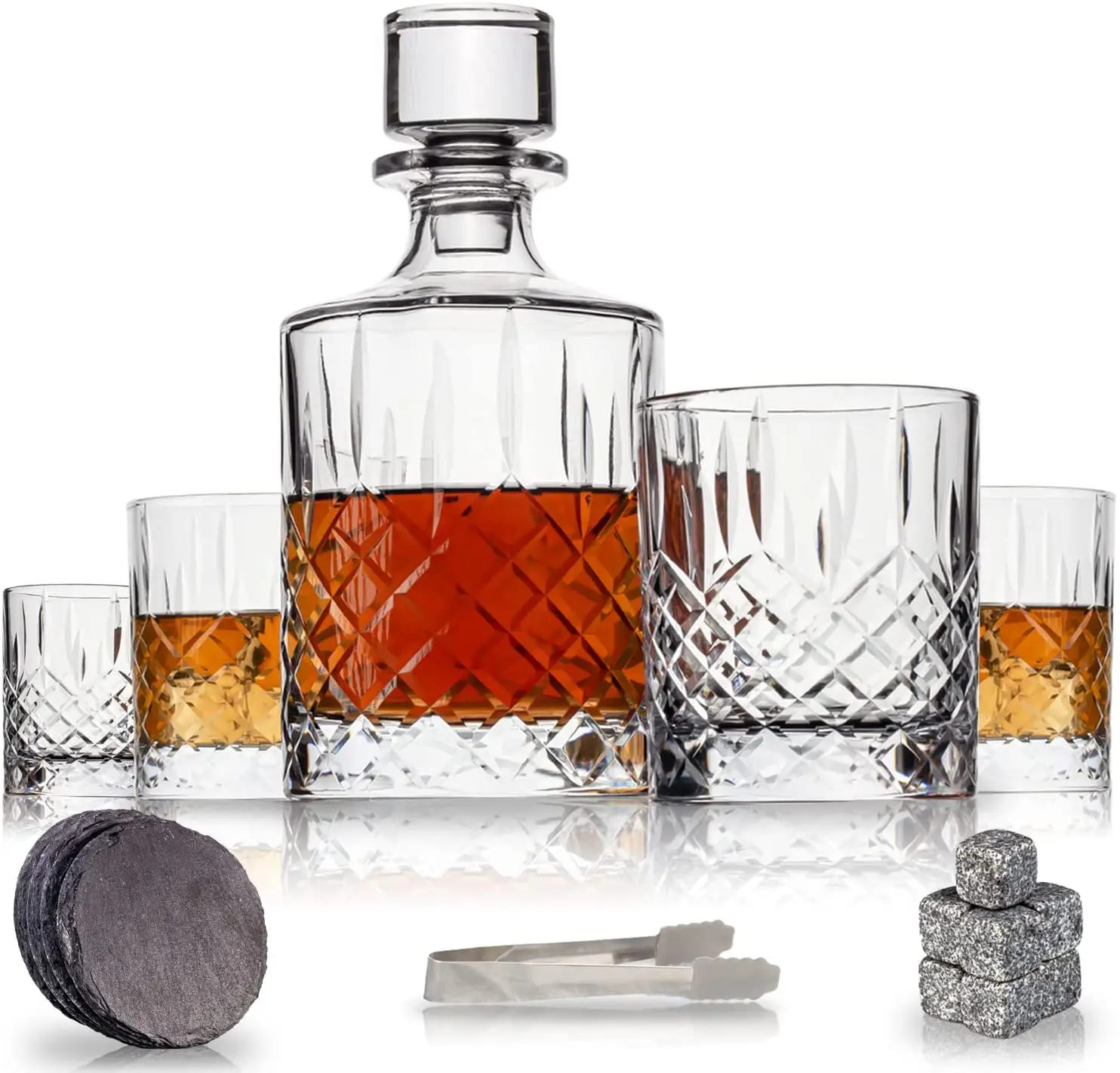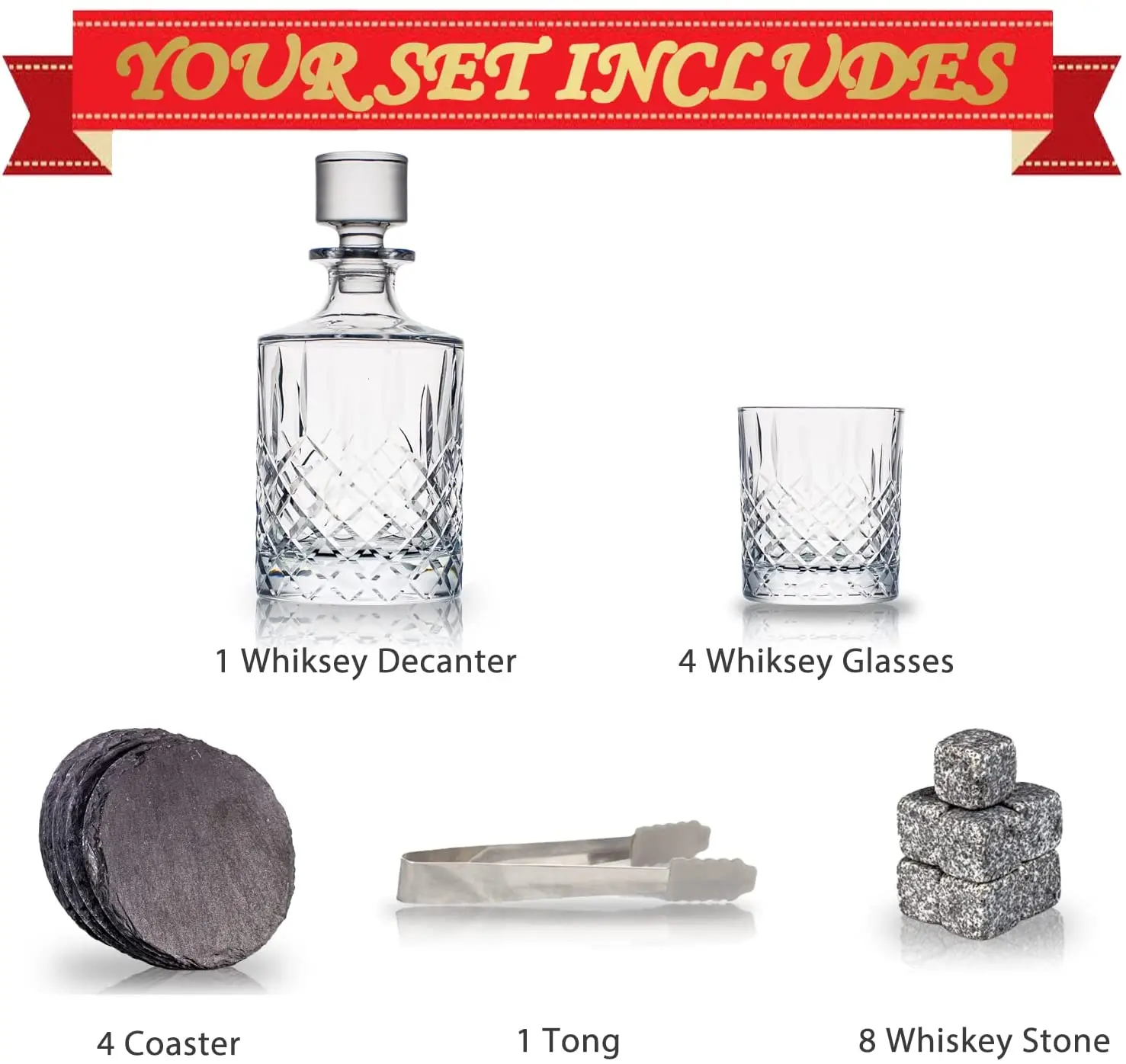 Hand Cut Whiskey Decanter Set with 4 Glasses, 4 Coasters, 8 Whiskey Stones