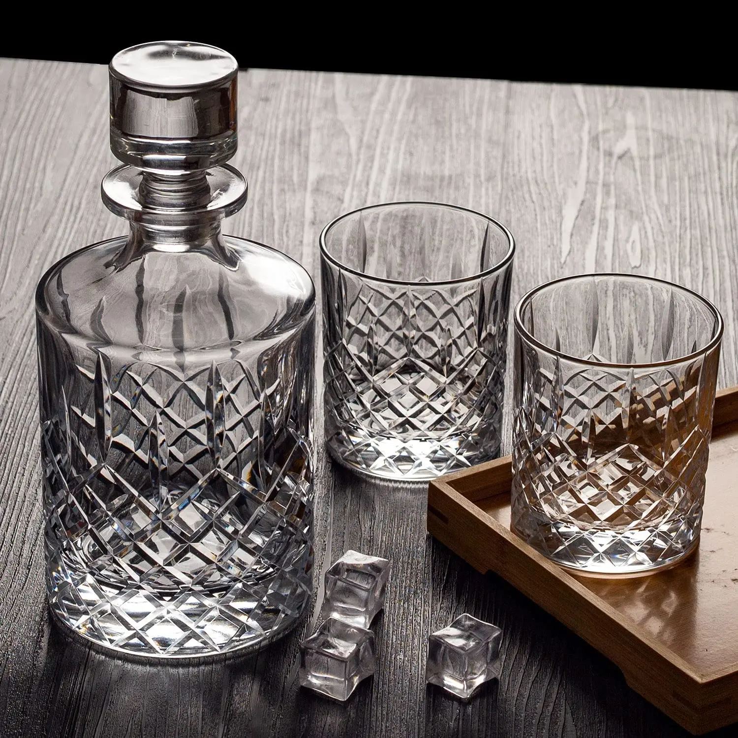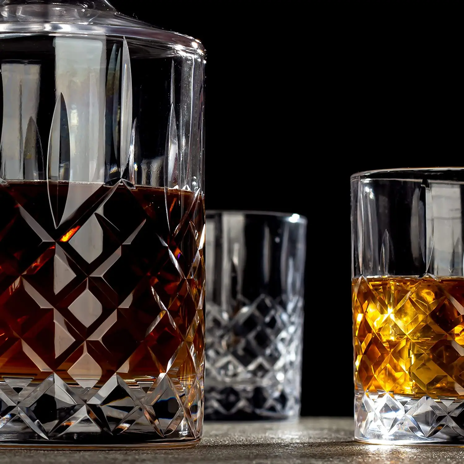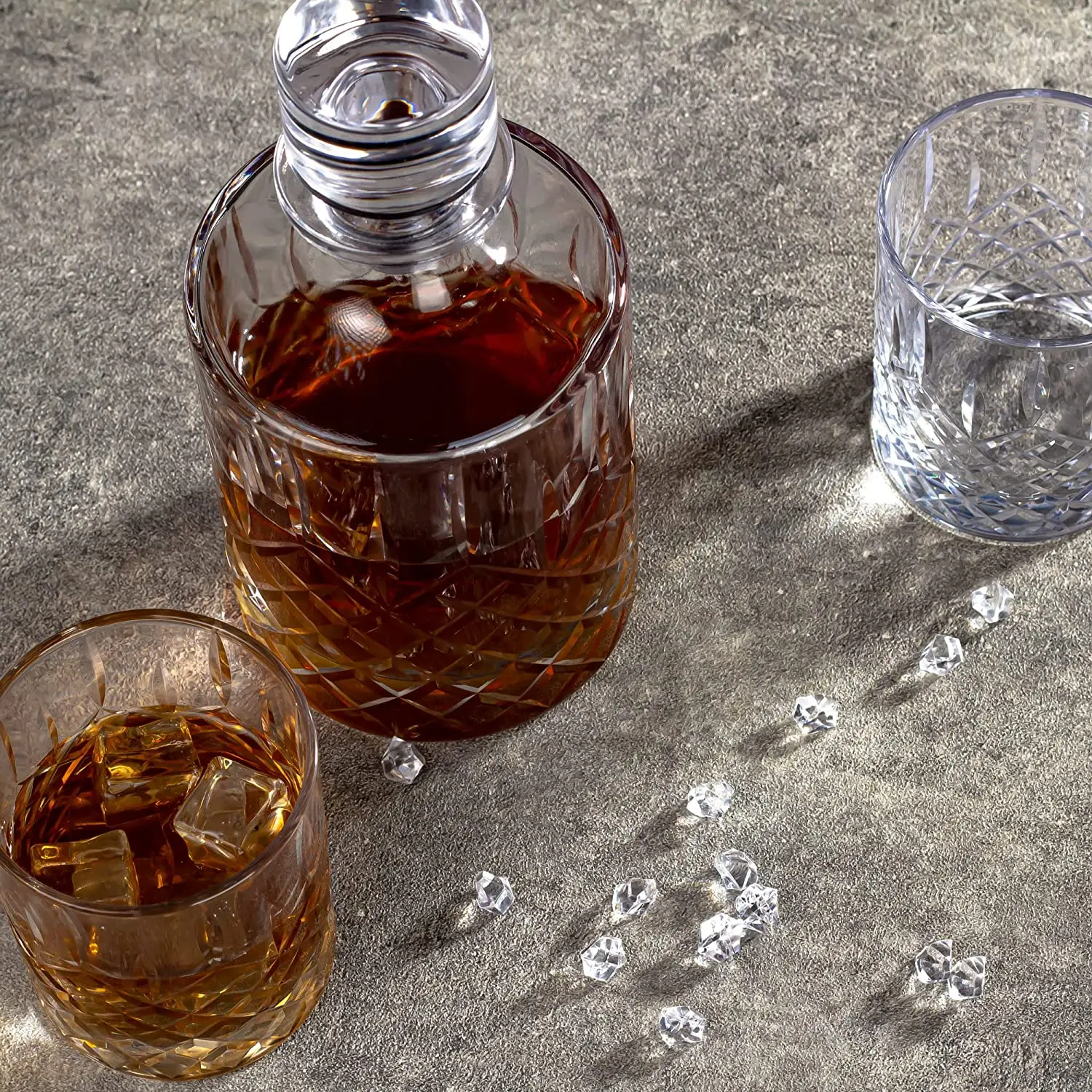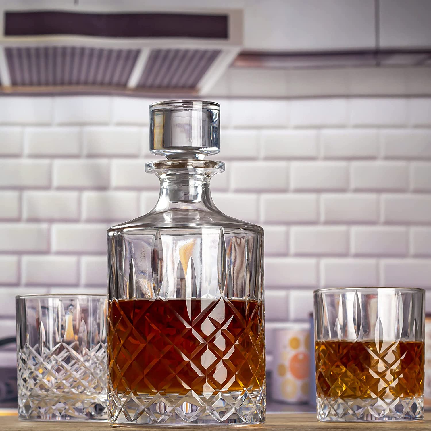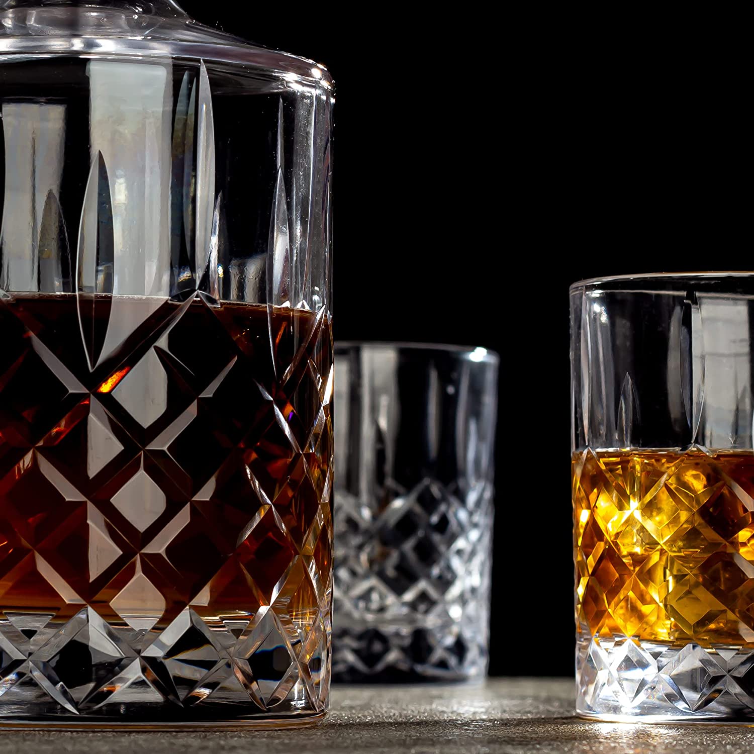 Hand Cut Whiskey Decanter Set with 4 Glasses, 4 Coasters, 8 Whiskey Stones